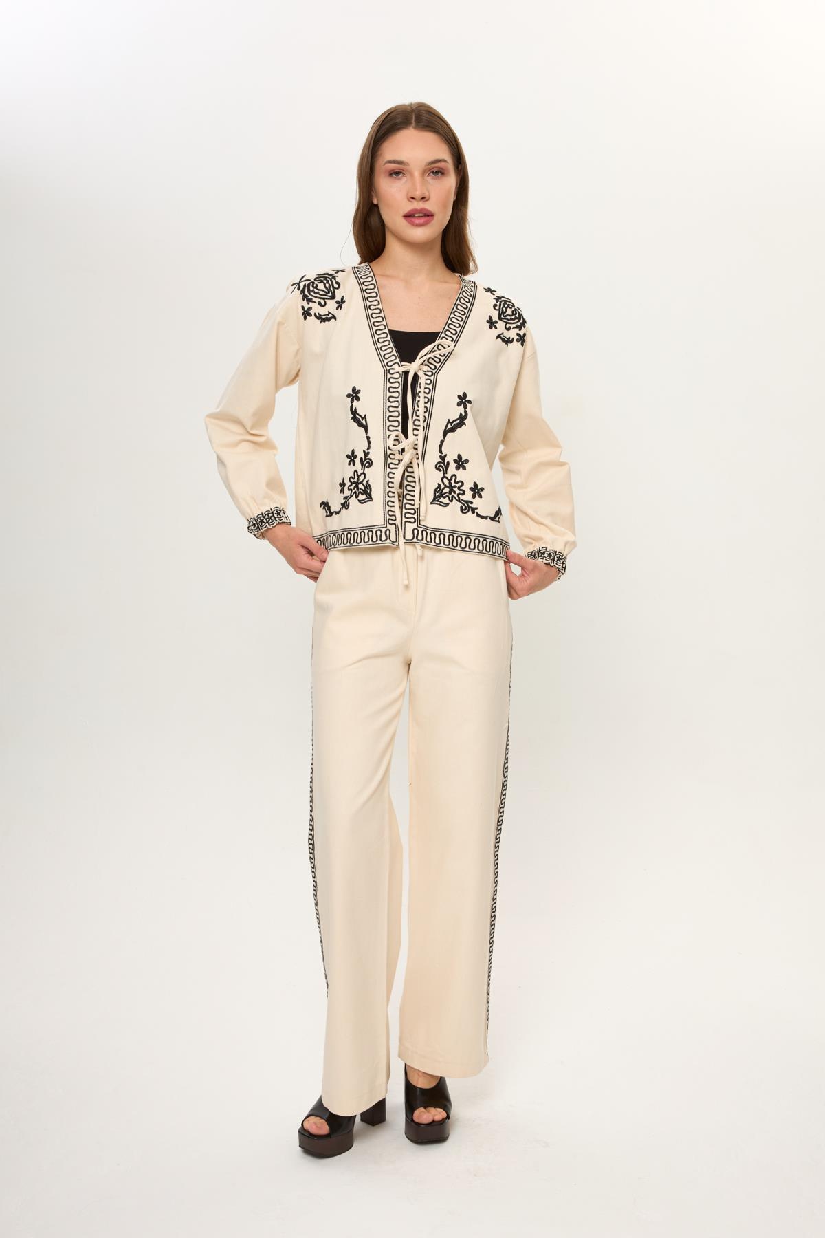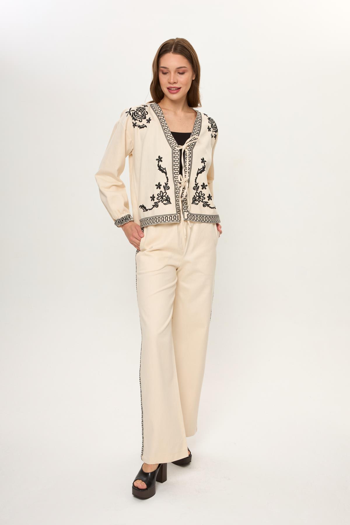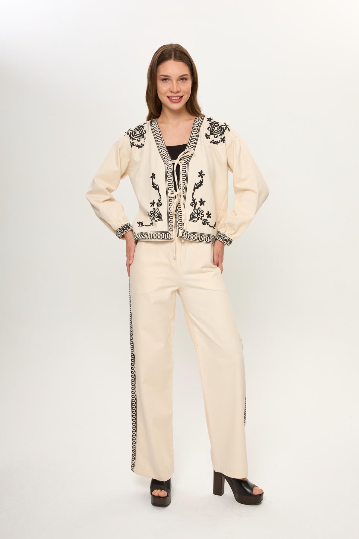 Kahverengi %100 Pamuk Nakış Detaylı Kadın Pantolon Bej %100 Pamuk Nakış Detaylı Kadın Pantolon