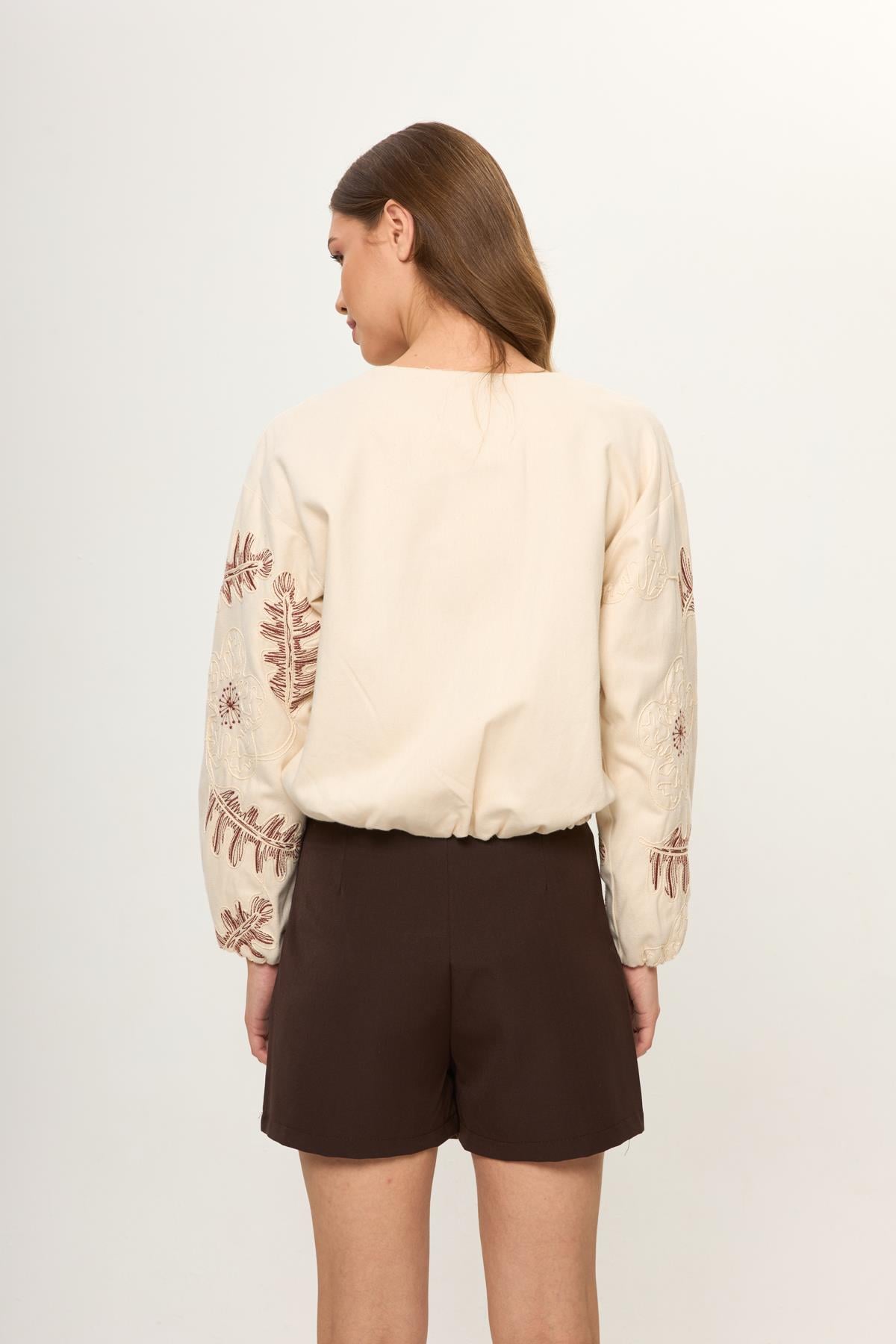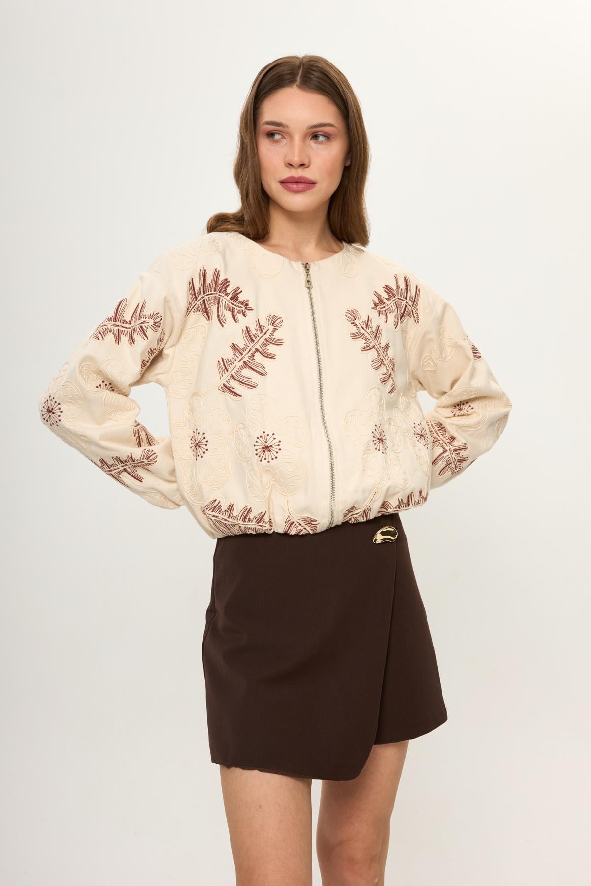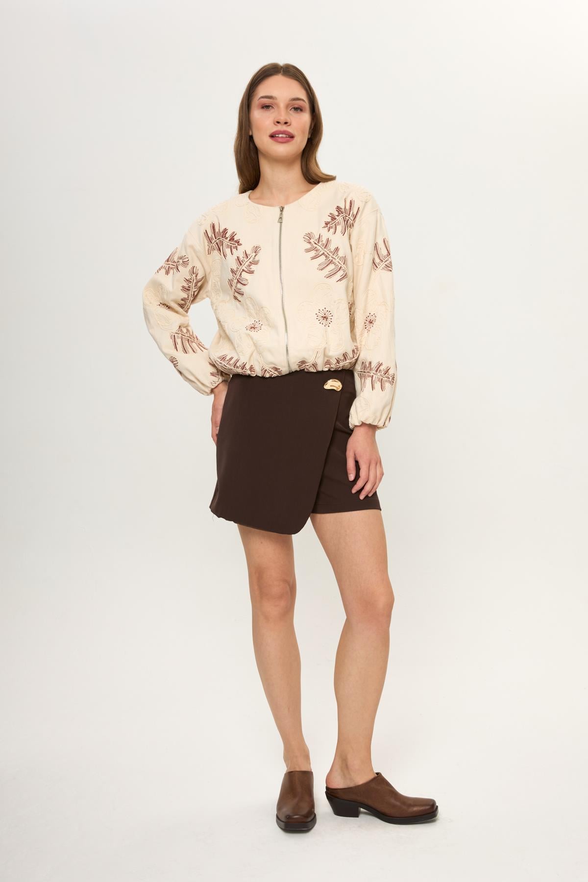 Kahve %100 Pamuk Nakış İşlemeli Kadın Bomber Ceket Bej %100 Pamuk Nakış İşlemeli Kadın Bomber Ceket
