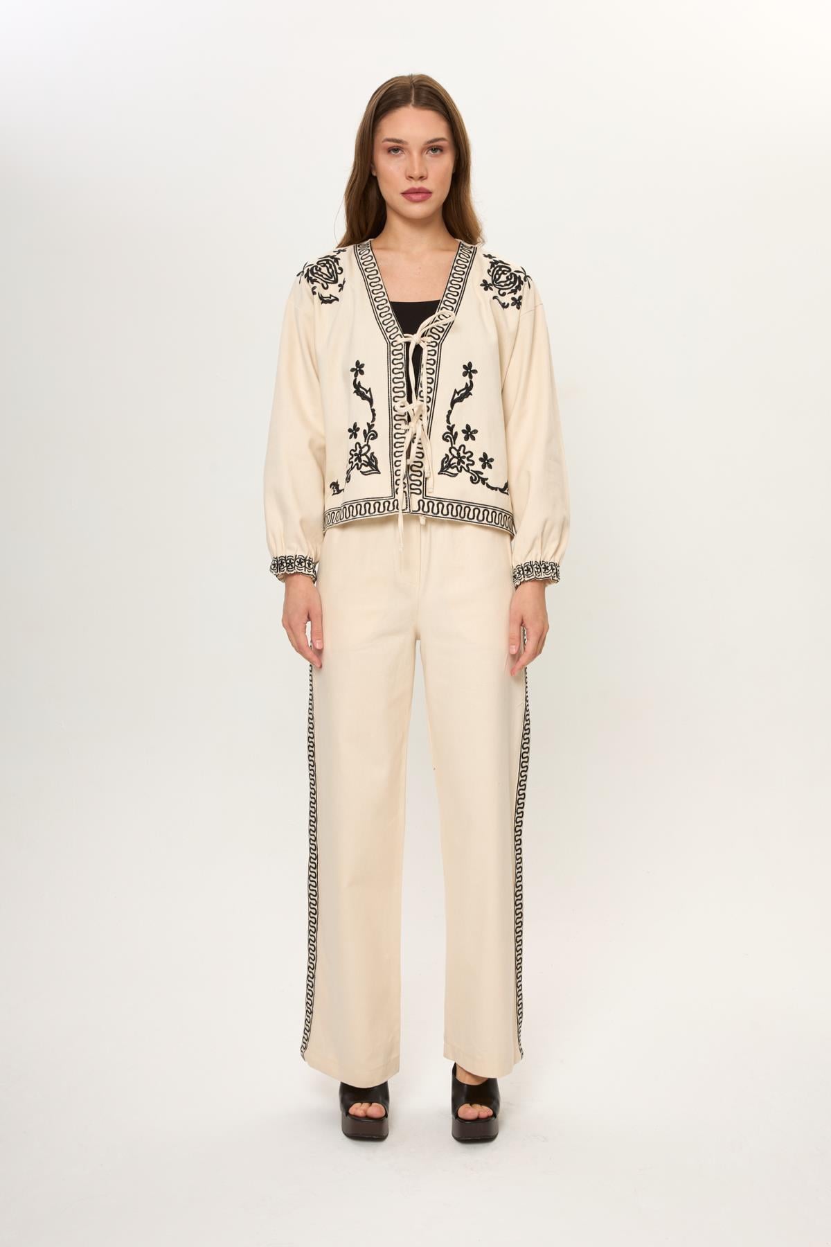 Kahve %100 Pamuk Önü Bağcıklı Nakış İşlemeli Kadın Ceket Bej %100 Pamuk Önü Bağcıklı Nakış İşlemeli Kadın Ceket