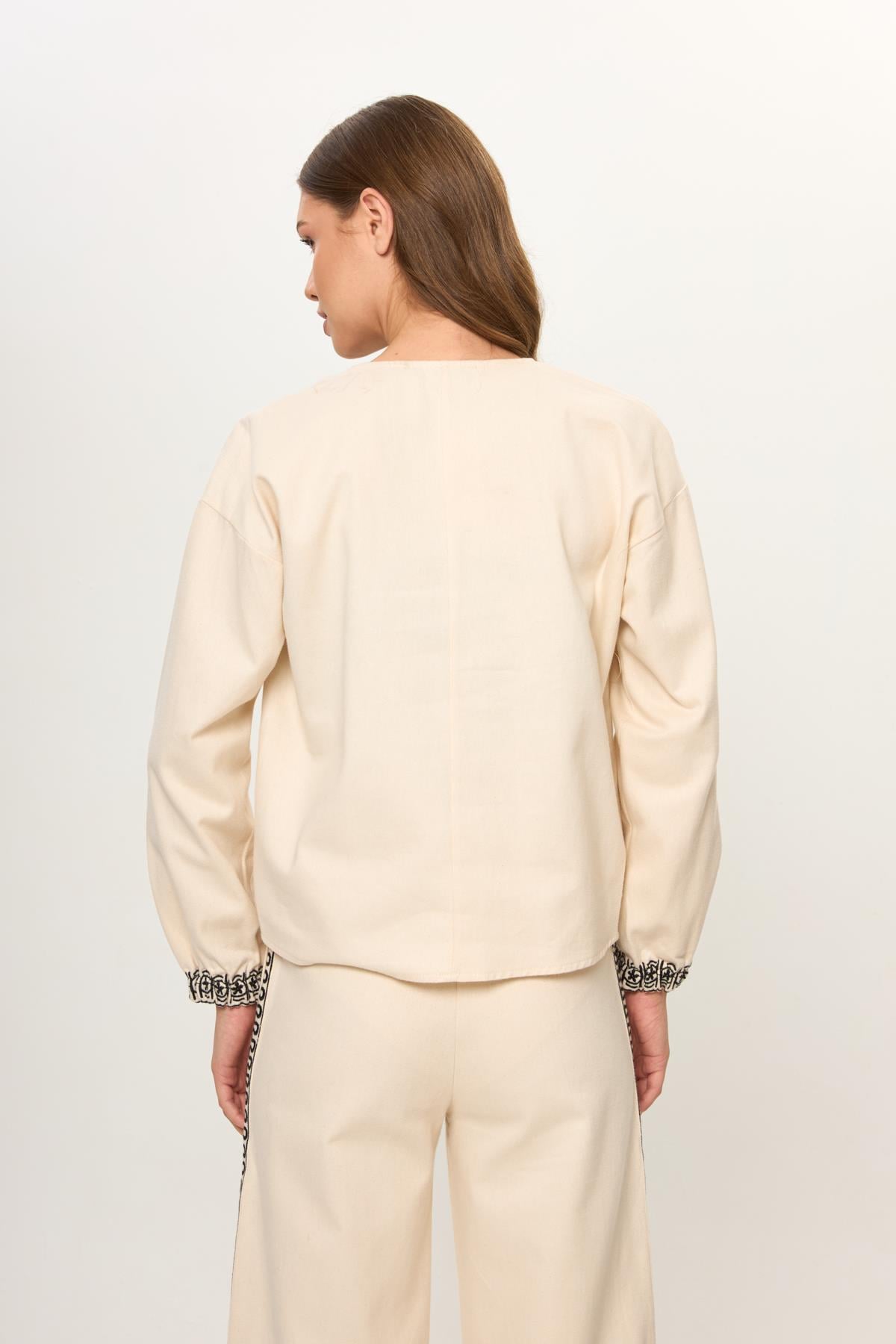 Bej %100 Pamuk Önü Bağcıklı Nakış İşlemeli Kadın Ceket (KMN0101Y)