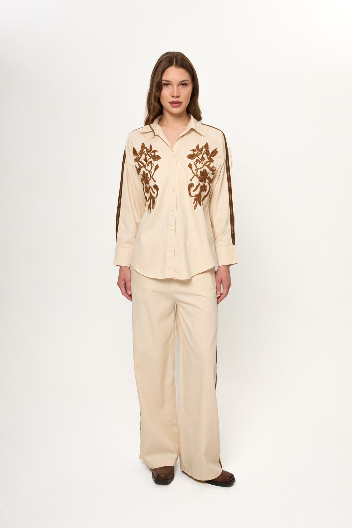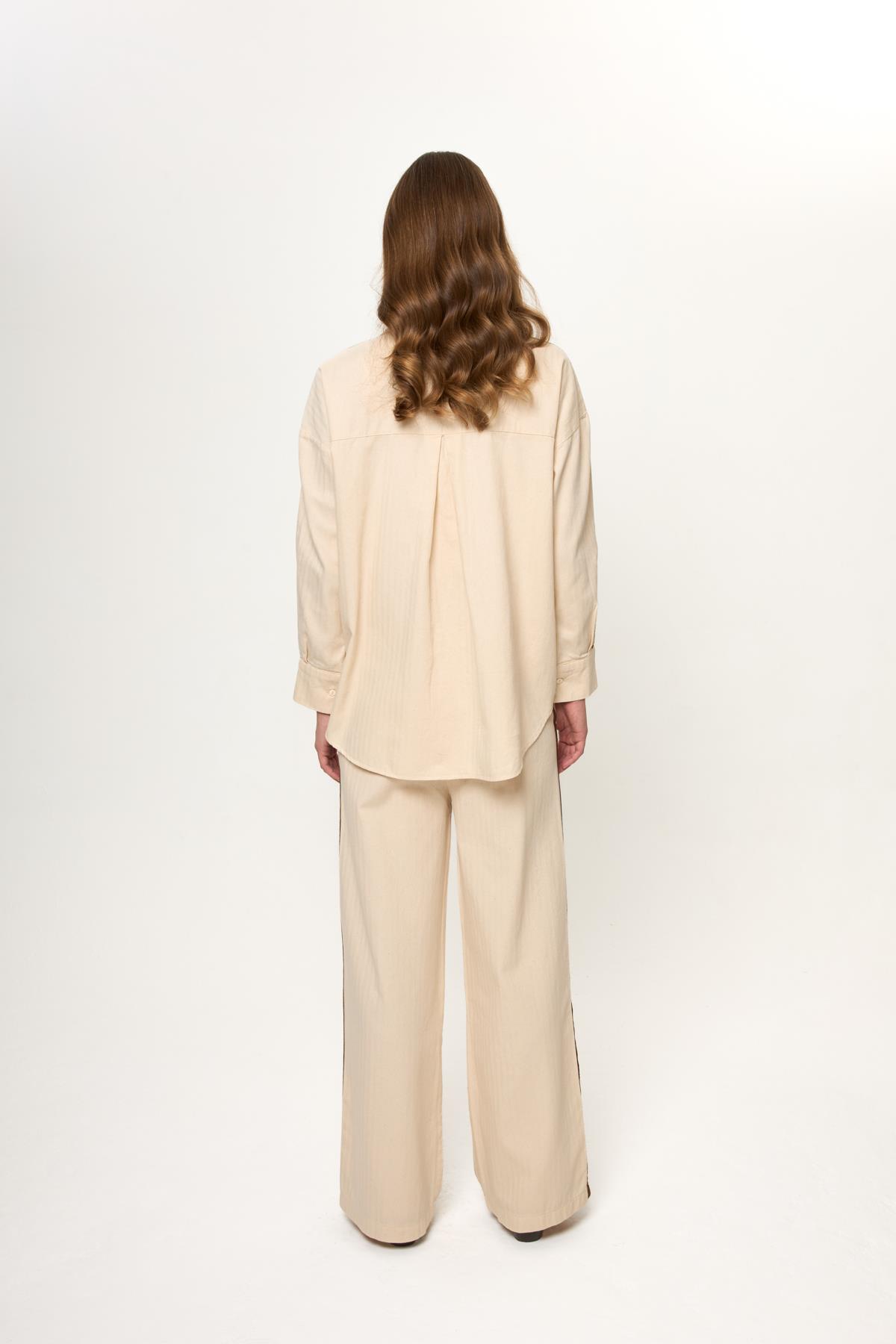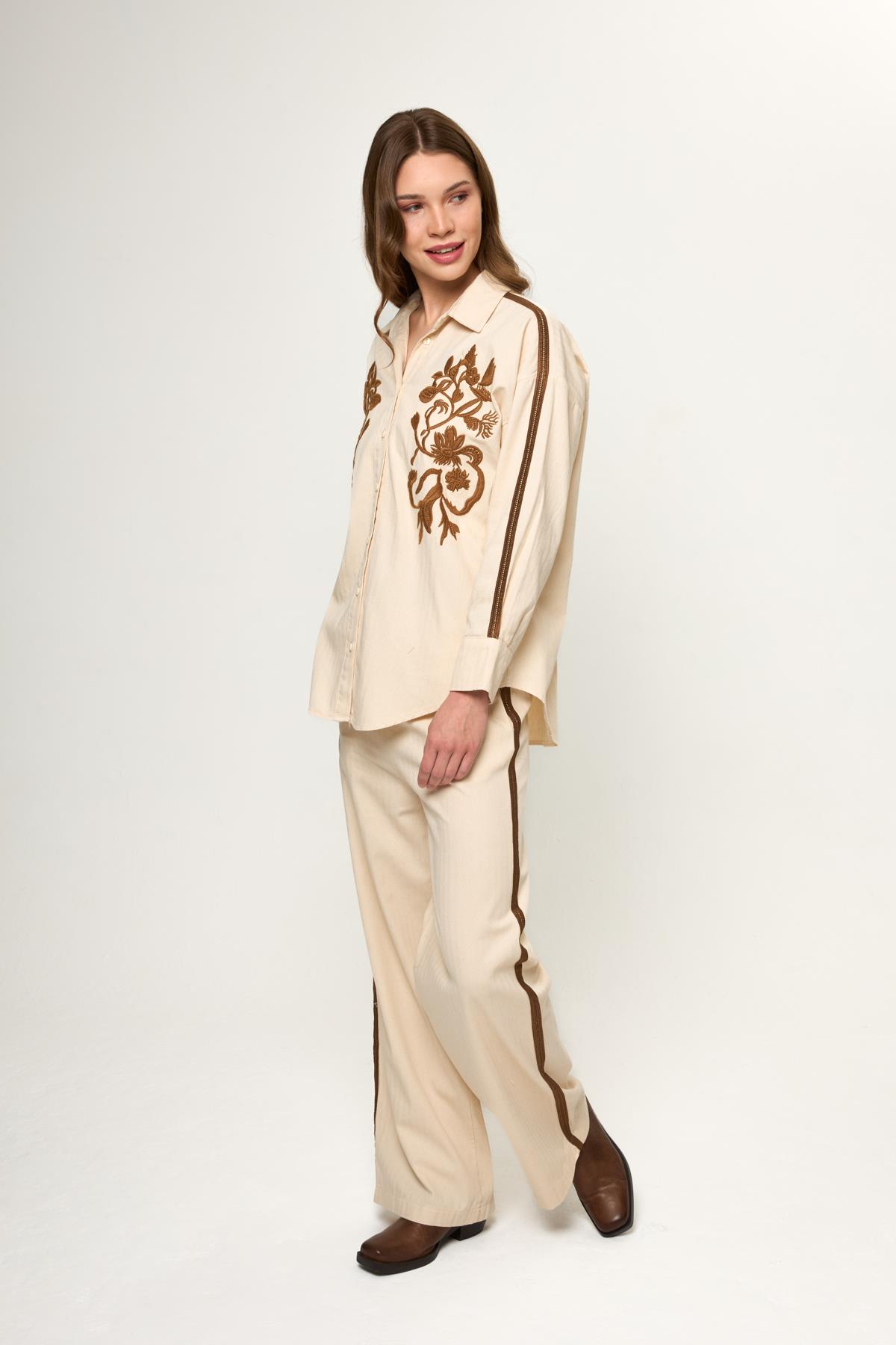 Bej %100 Pamuklu Yanları Şerit Detaylı Rahat Kalıp Kadın Pantolon