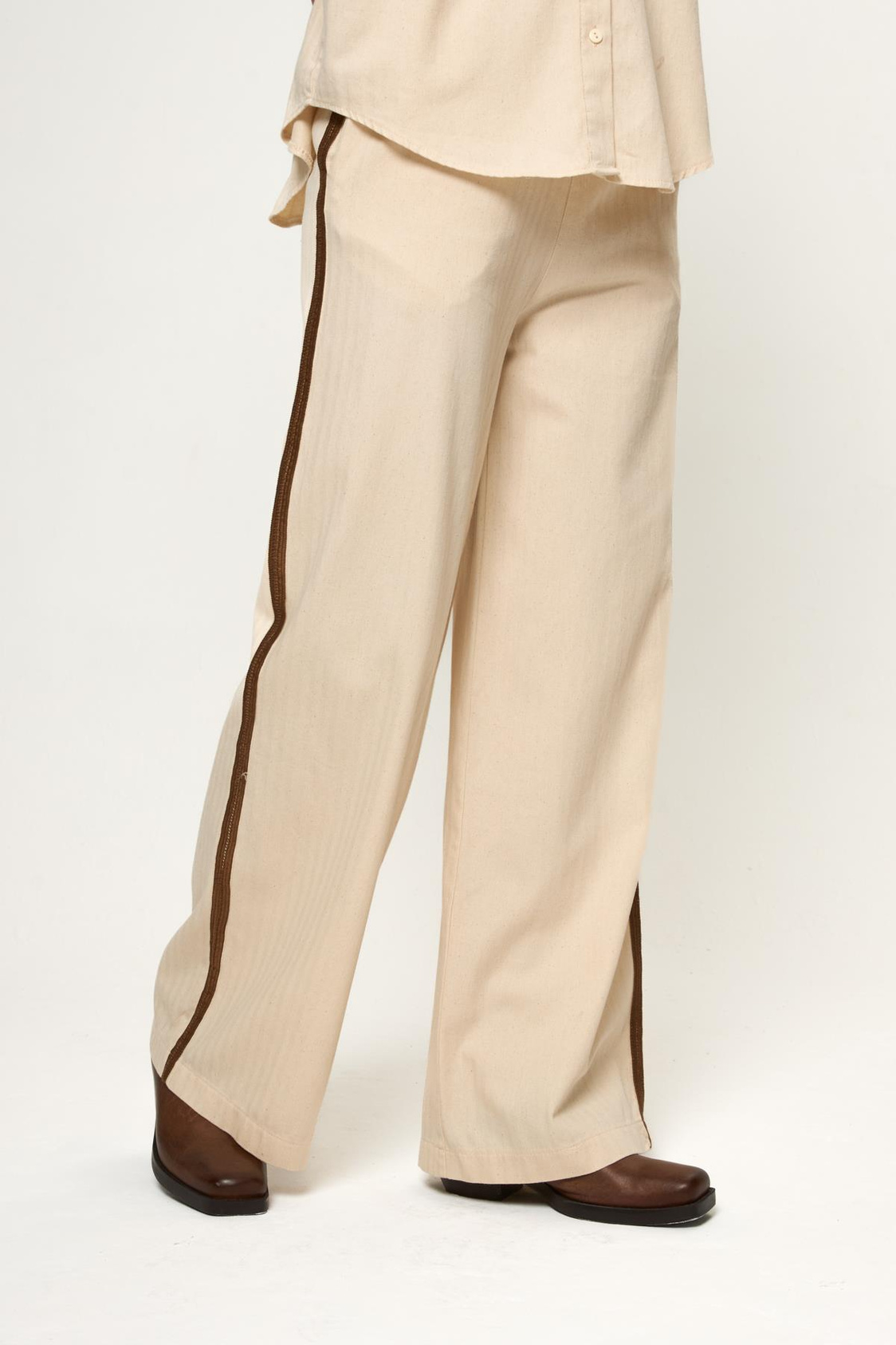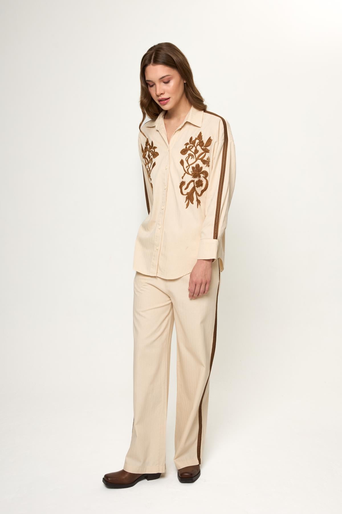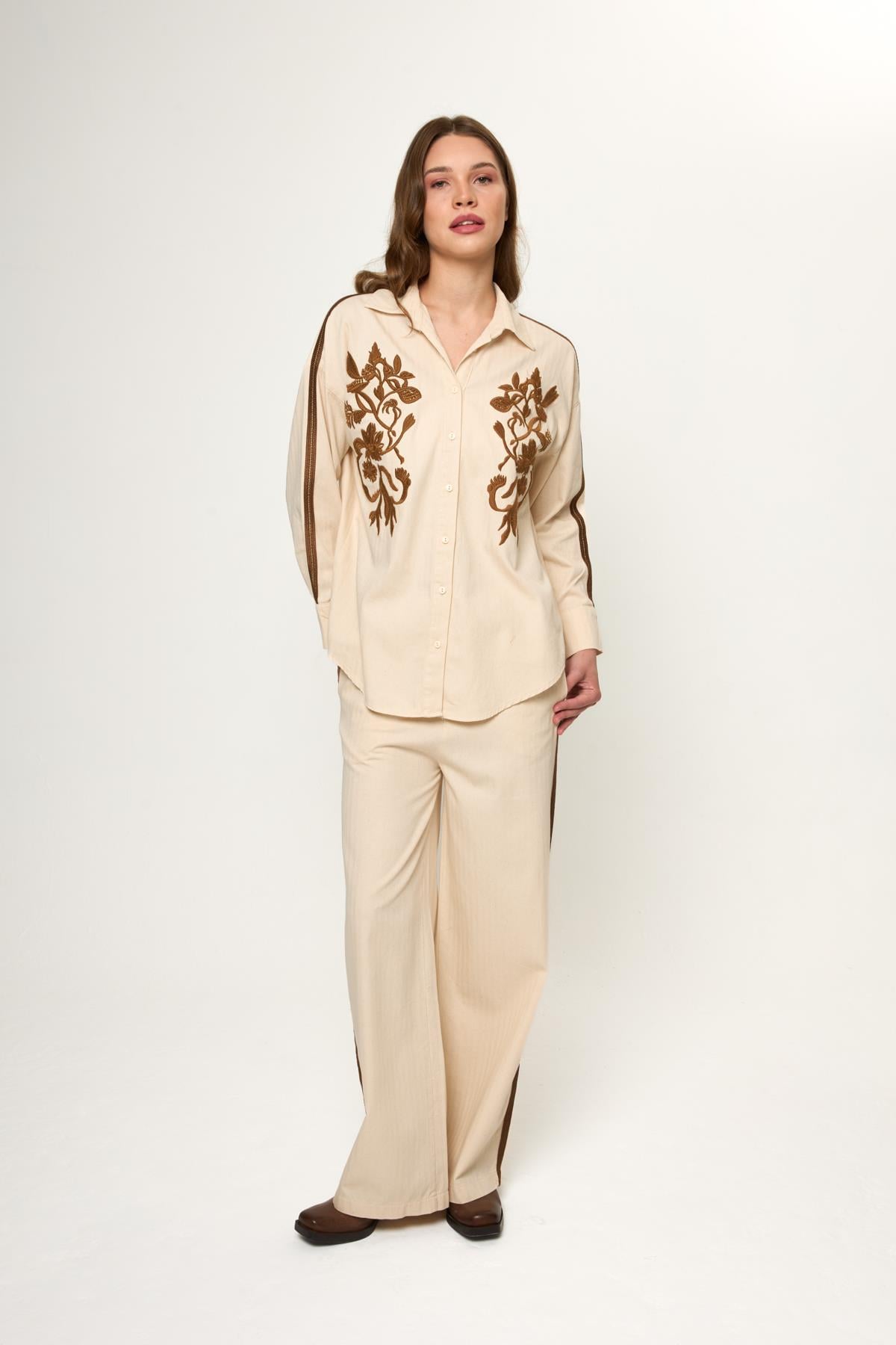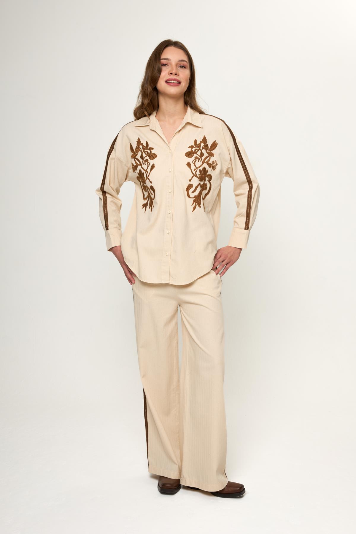 Bej %100 Pamuklu Yanları Şerit Detaylı Rahat Kalıp Kadın Pantolon
