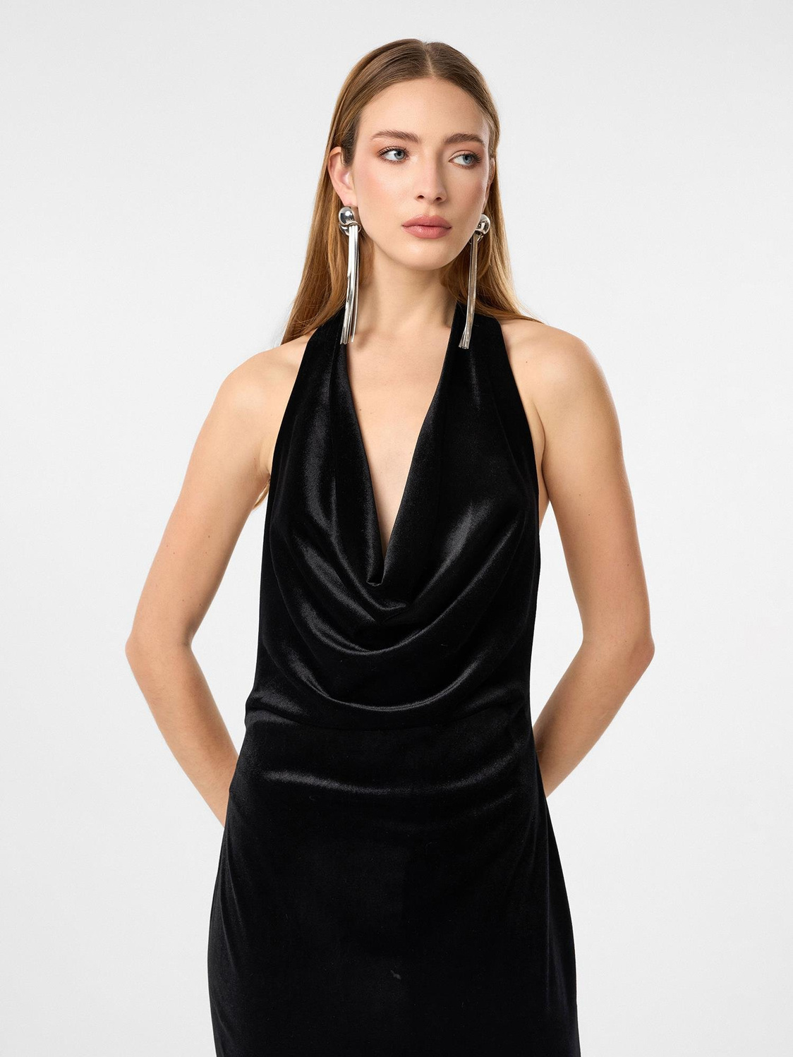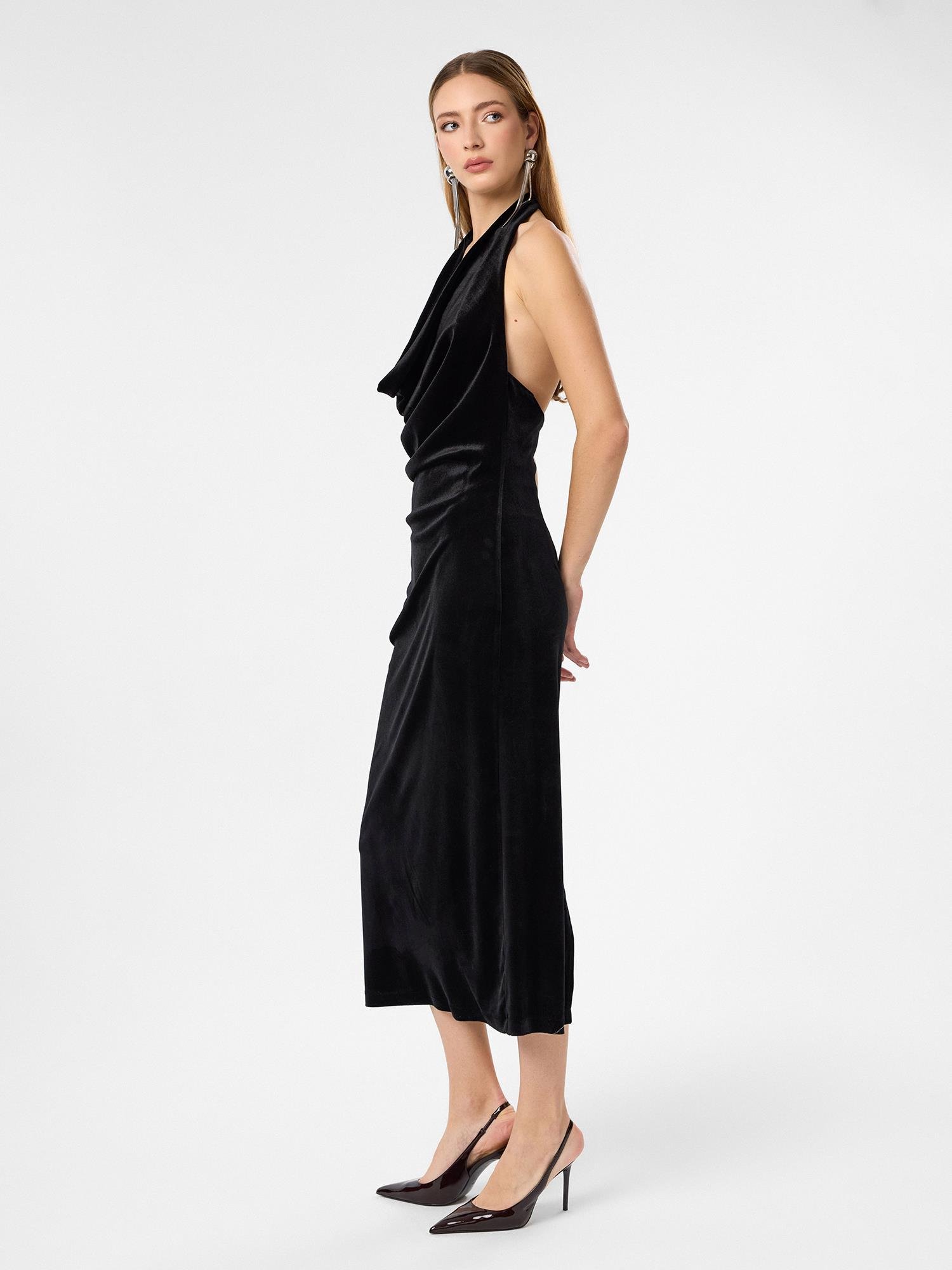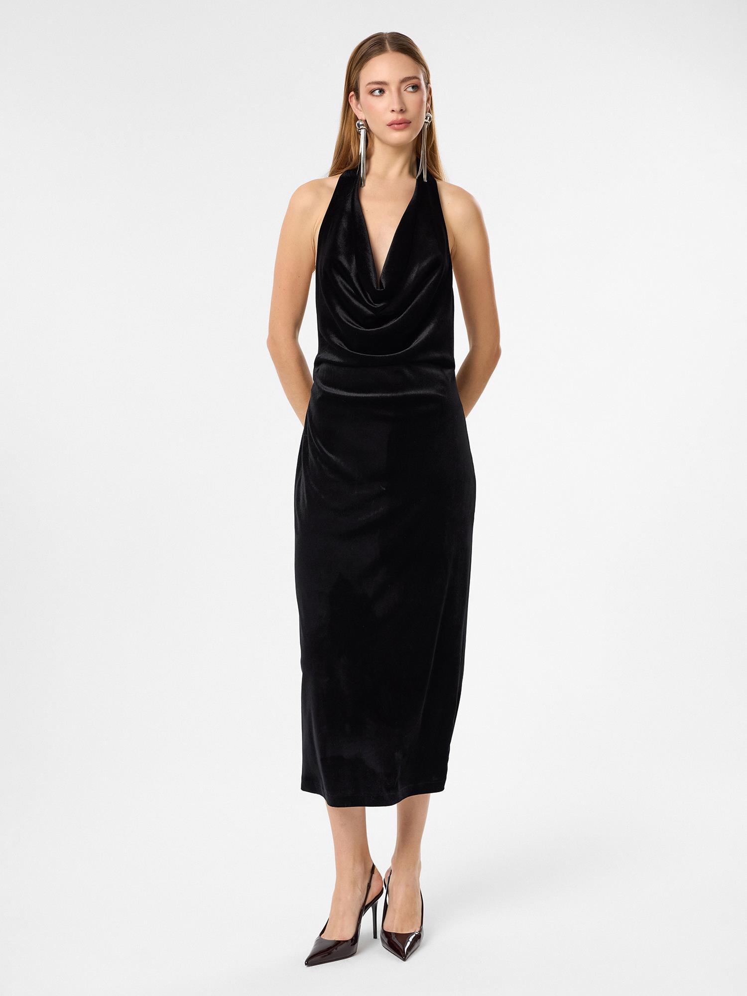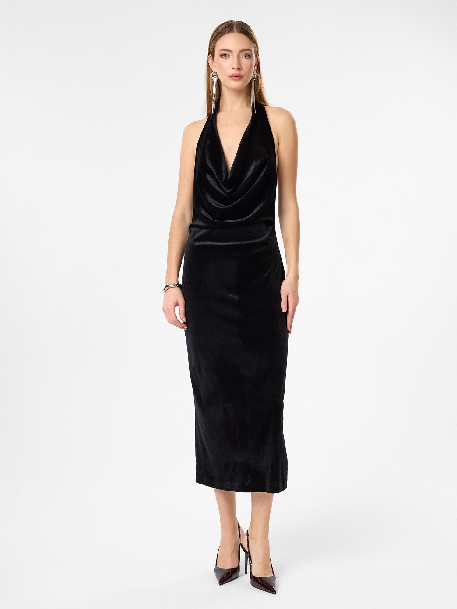 Yumuşak dokusu ve asil duruşuyla öne çıkan kadife elbise, özel davetlerden akşam şıklığına kadar her ortamda zarafetinizi ön plana çıkarır.