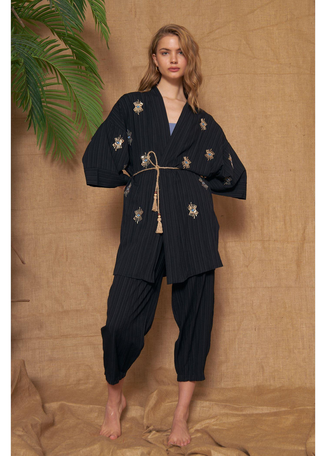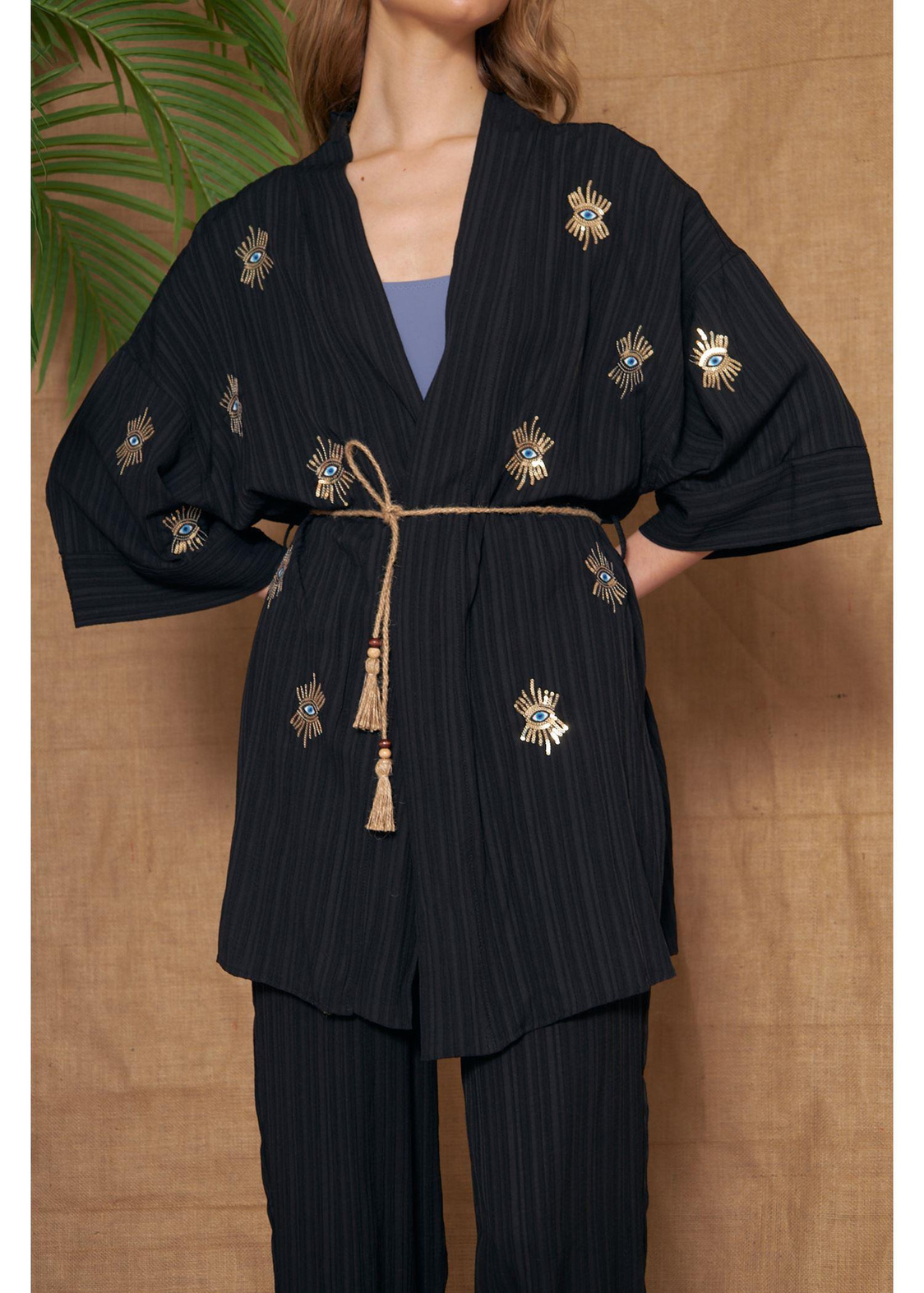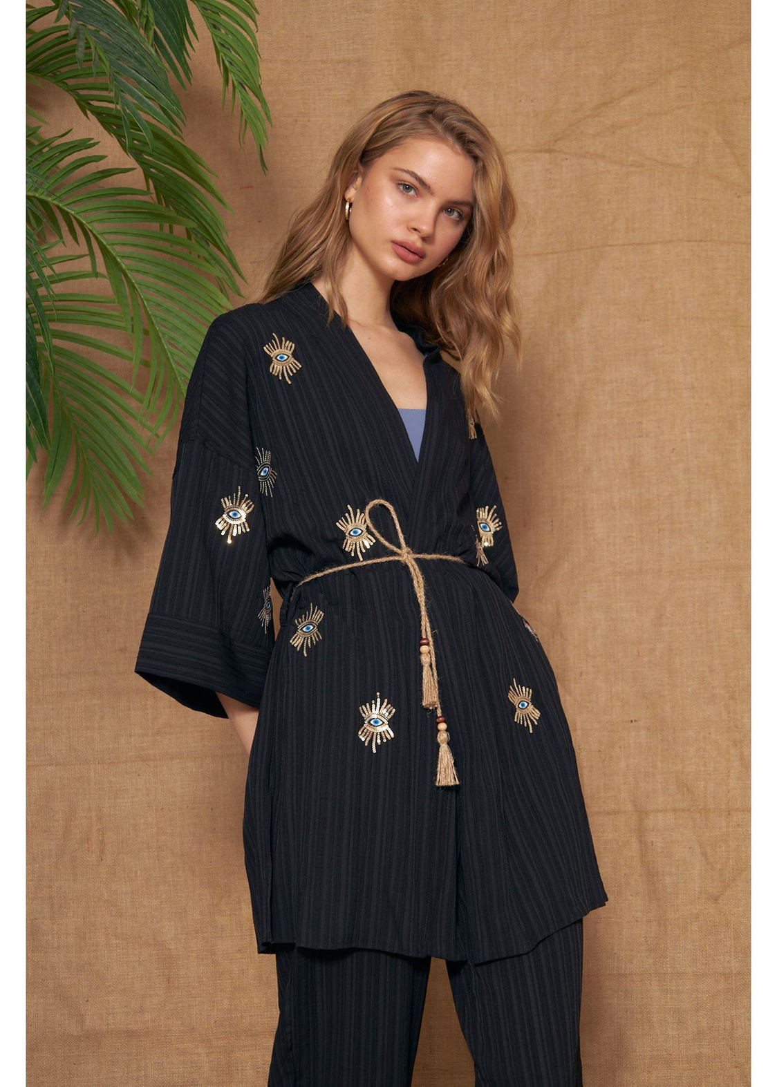 Göz Nakışlı Keten Görünümlü Kimono (KMN0042Y)