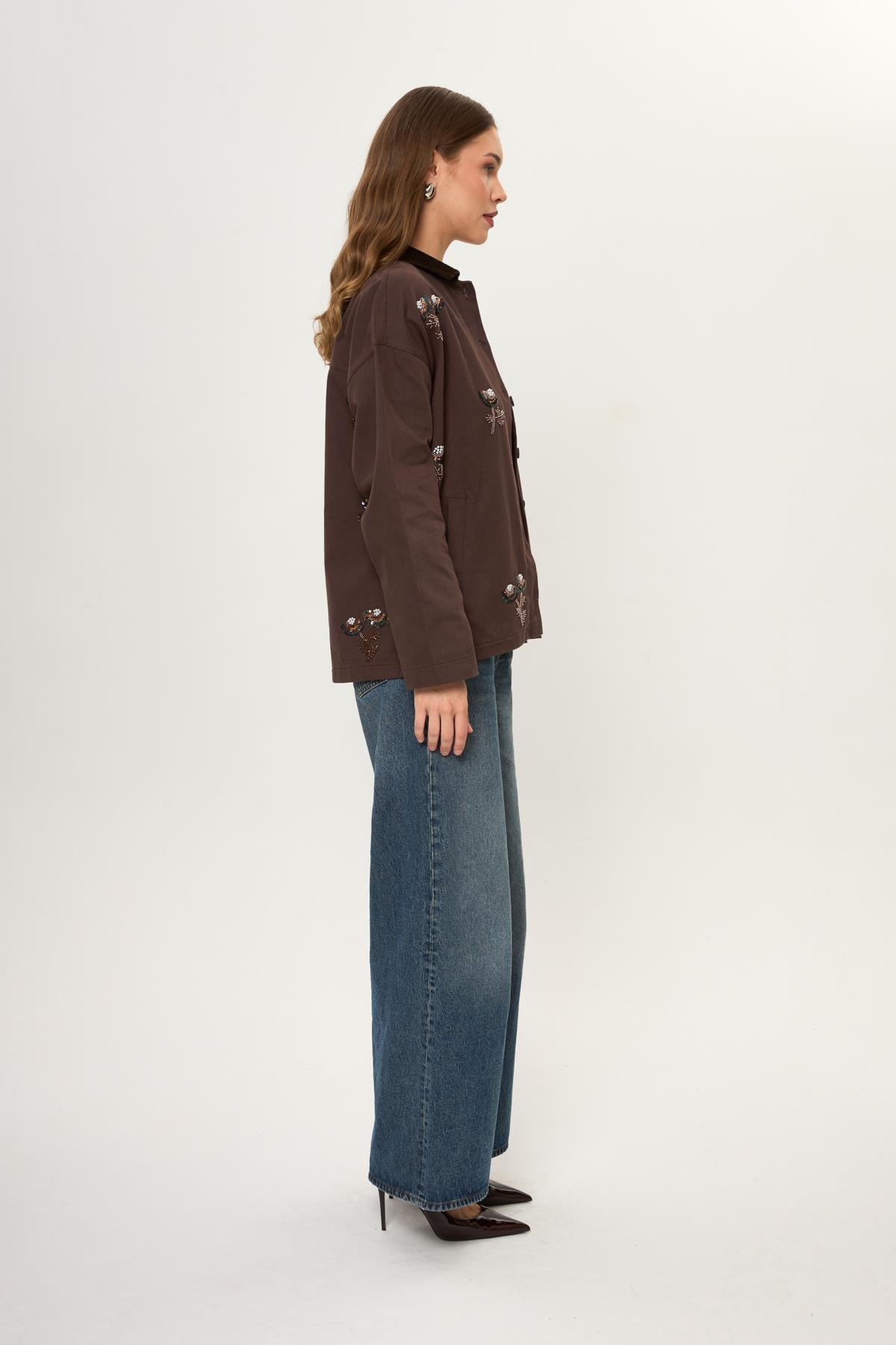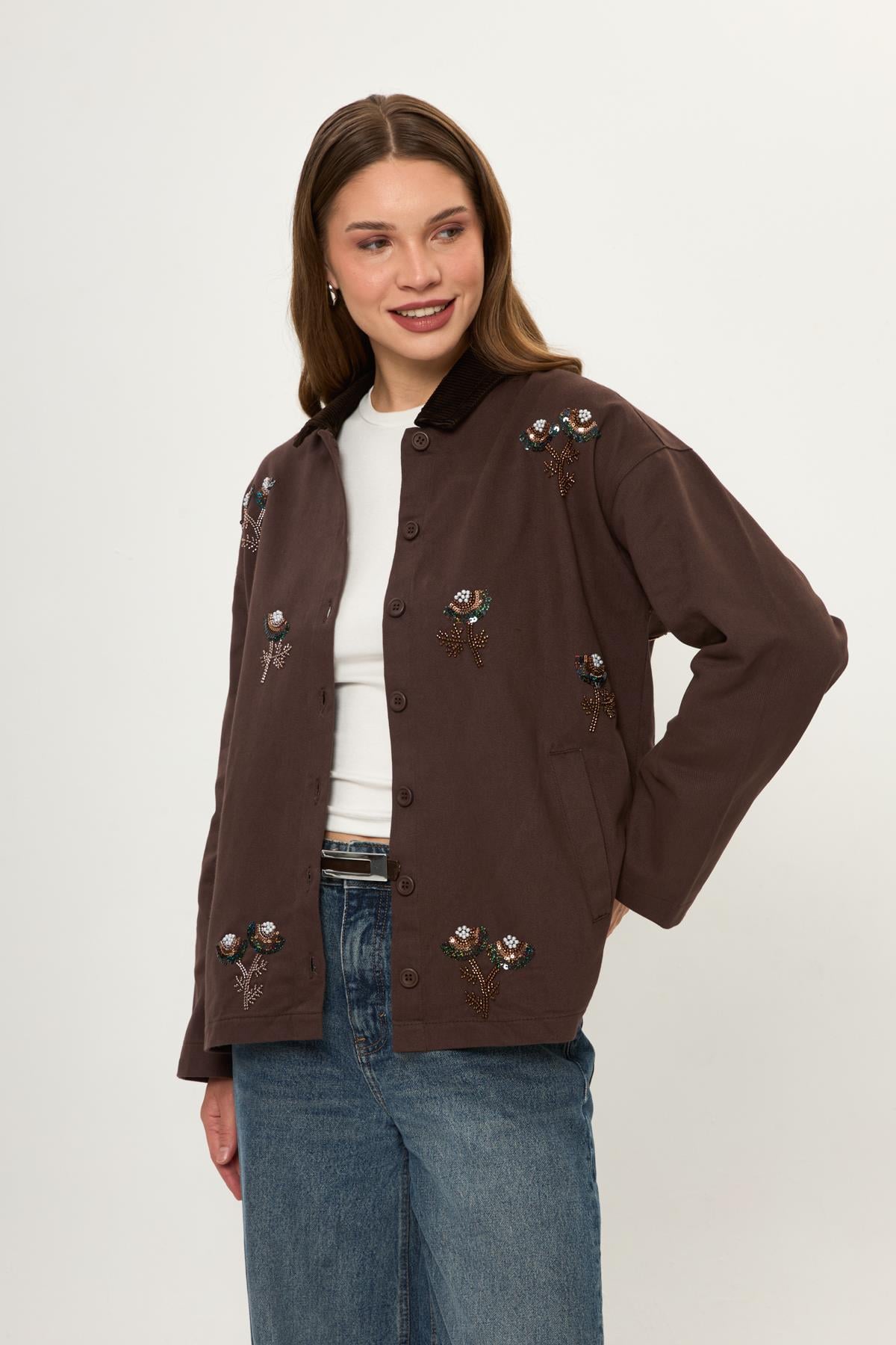Kadife Yakalı Nakışlı Pamuklu Ceket (CKT0180Y)
