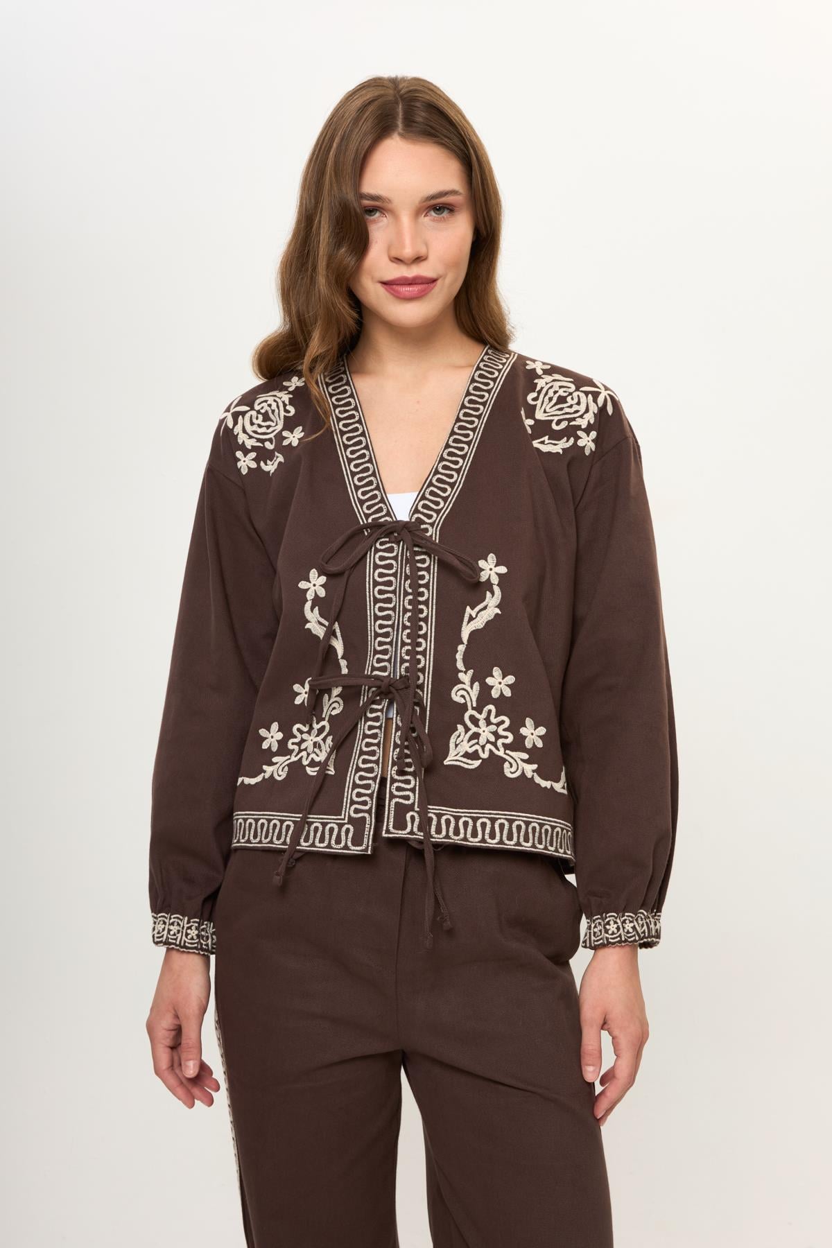 Kahve %100 Pamuk Önü Bağcıklı Nakış İşlemeli Kadın Ceket Bej %100 Pamuk Önü Bağcıklı Nakış İşlemeli Kadın Ceket