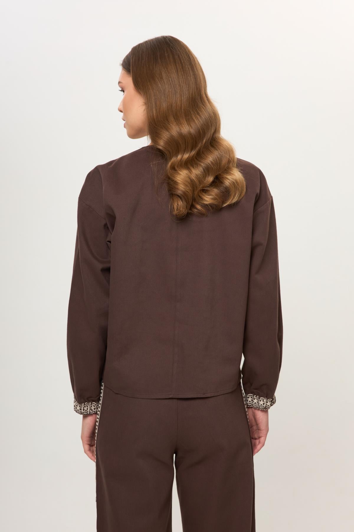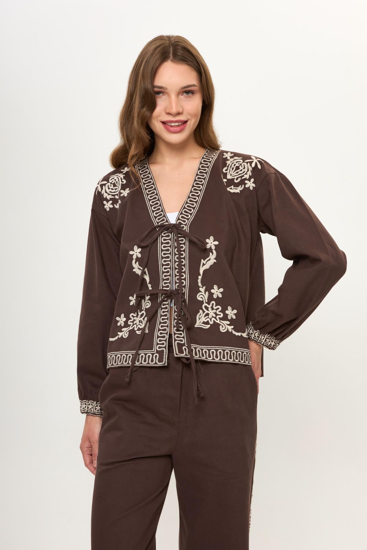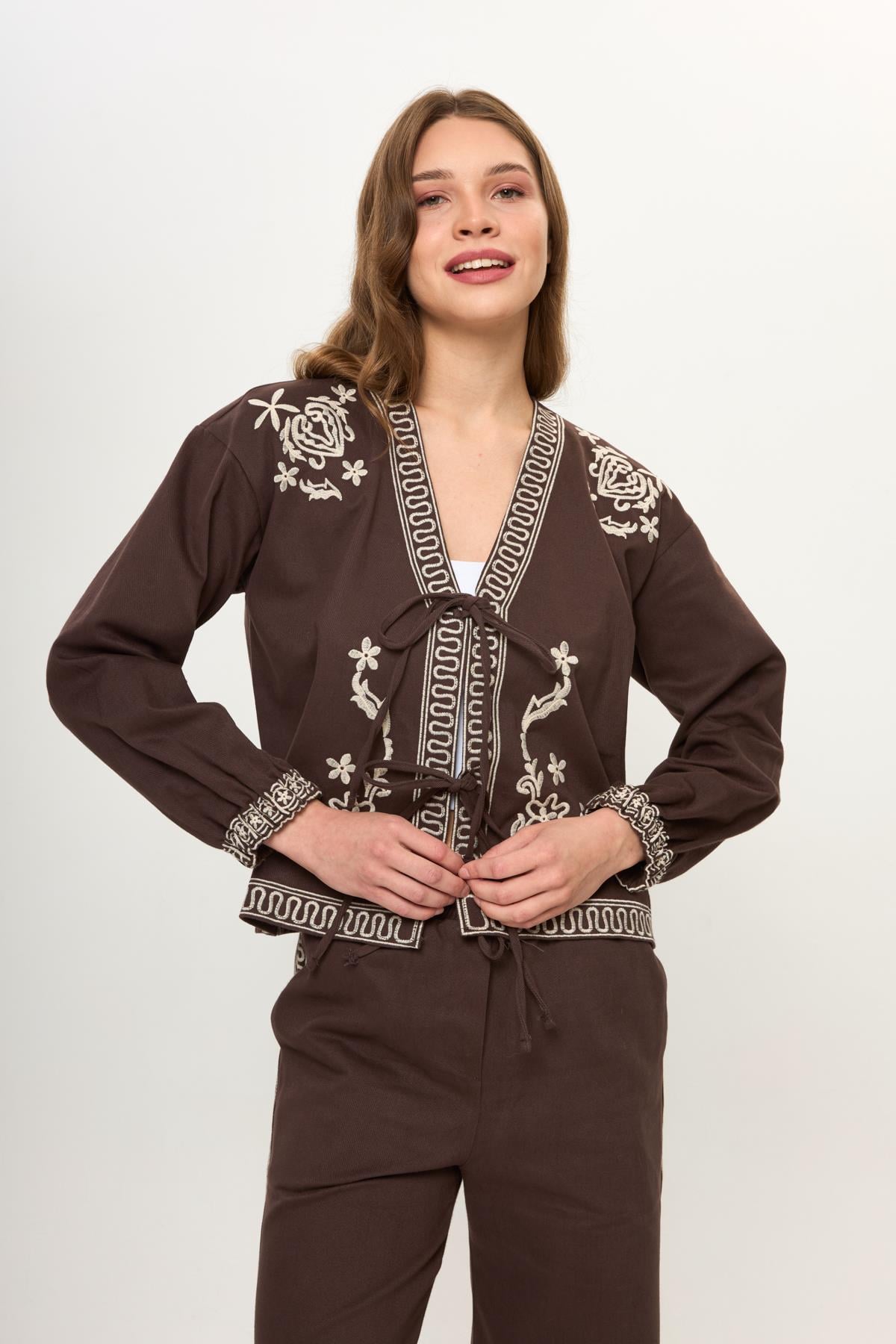 Kahve %100 Pamuk Önü Bağcıklı Nakış İşlemeli Kadın Ceket (KMN0101Y)