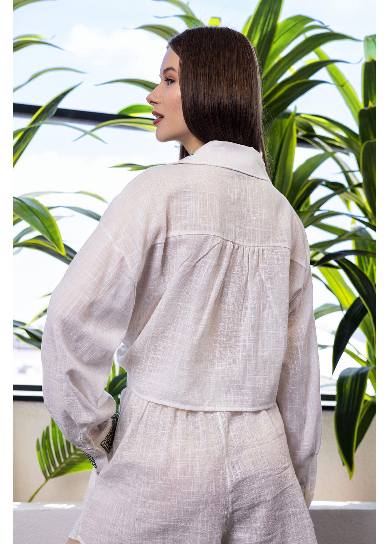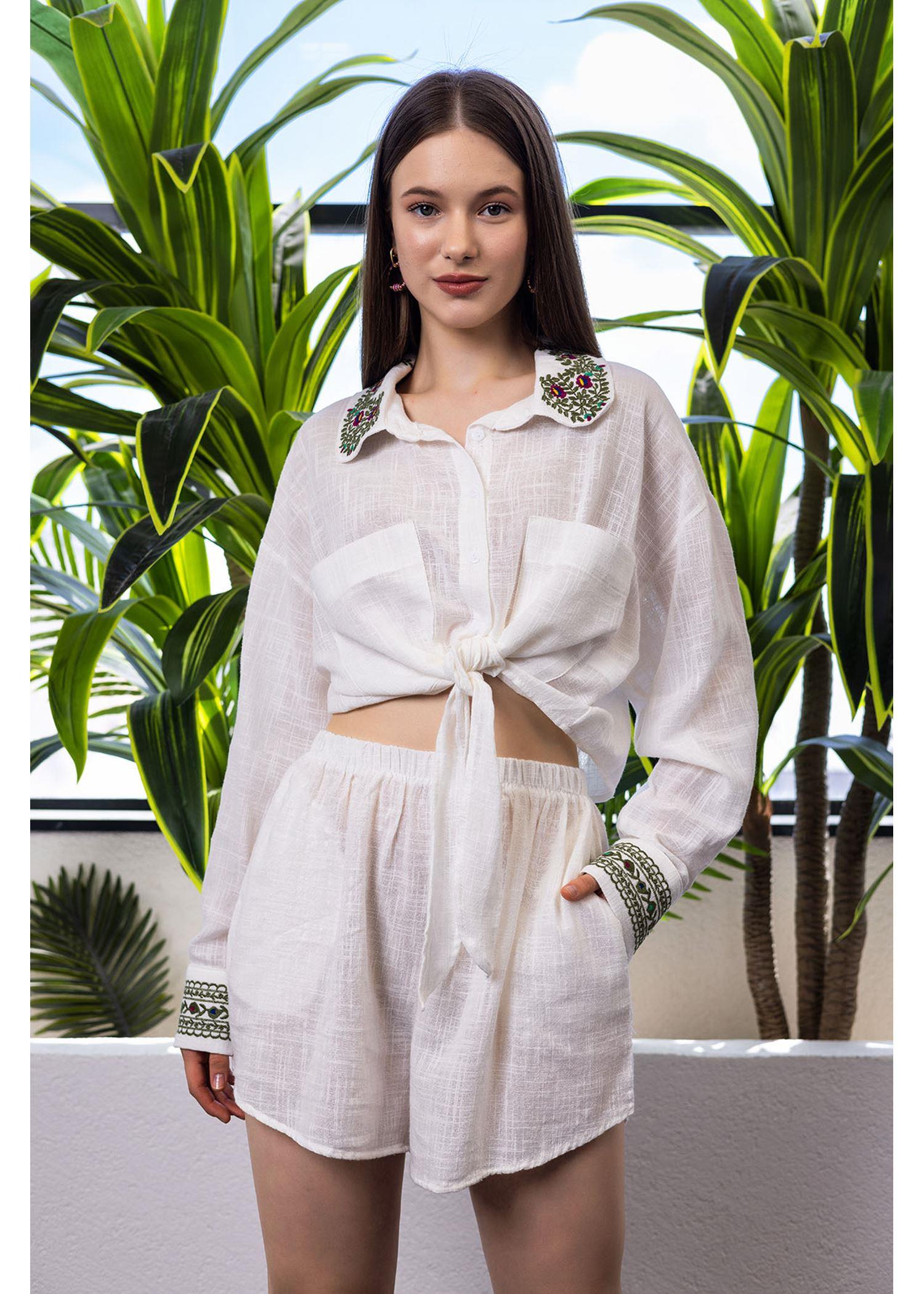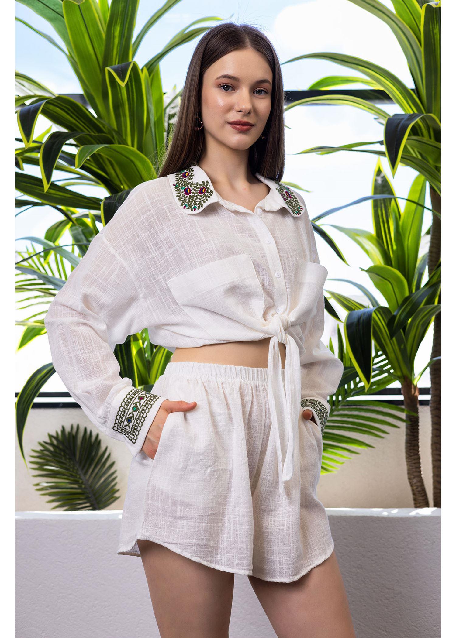 Önden Bağlamalı Nakışlı Keten Görünümlü Gömlek (GML0149Y)